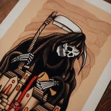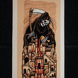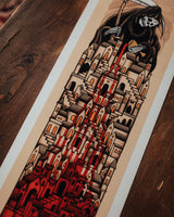 I was asked to create something for a 'Nowt Special' show around the theme of horror/darkness/folklore, and I thought, what’s darker than the reality that we’re living in at the moment. The design was inspired by the current state of the world, and the phrase ‘trickle down’ economics was a key bit of inspiration. The Grim Reaper represents the super wealthy, feeding from the work of the community, whilst insisting that the benefits will eventually come to the town. But in reality, they’re hoarding for themselves, creating hate, division and anger, in turn destroying the community. The ‘trickle down’ continues to flow through the town until it is fully consumed.
