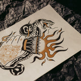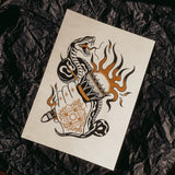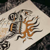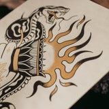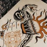 Screen printed by hand, the 'Reduced to ashes' print features a snake and a hand holding a burning torch. Inspired by traditional tattoo design, but putting our spin on it to work well as a screen printed design.