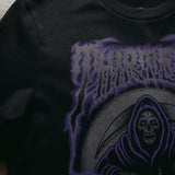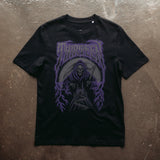 The 'Harvester Of Death' T-shirt features a full two-colour front print - it's a colour combination we've never tried before but love how it turned out. The purple and black on black mix looks great together, and it's a darker edge, which we like leaning into around Halloween.