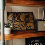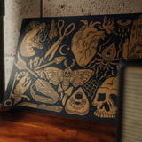 Our 'Oddities' Design is a tattoo flash-inspired design, composed of numerous individual odd illustrations. It's a metallic gold screen print, on black card and is available as a T-shirt and oversized shopper.
