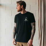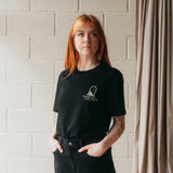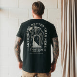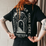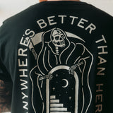 The 'Anywhere's Better Than Here' t-shirt inspired the entire collection. It includes a grim reaper leading you to a different location, this design resonates with our universal desire to escape from this world at times.