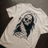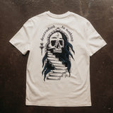 The 'Descending To Nothing' T-shirt features a Reaper printed in custom mixed blue and black, overlooking a traditional descending staircase.