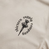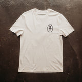 - Off white t-shirt with an aged black chest and back print.
