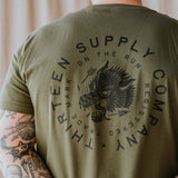 Our 'ON THE RUN' design features an aggressive wolf head shattering an arrow, confined within a traditional lettering lock-up.